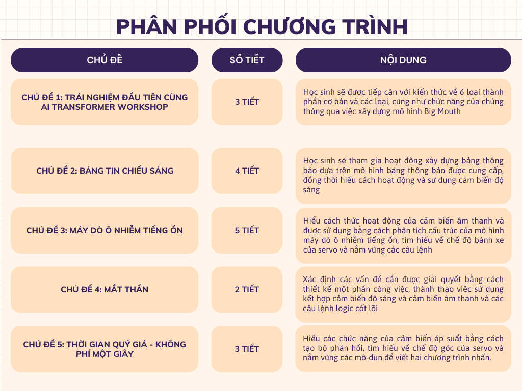 Chương trình học AI Transformer Workshop sẽ trang bị cho học sinh kiến thức cơ bản về ứng dụng của trí tuệ nhân tạo trong đời sống thông qua các chủ đề học tập mang tính trải nghiệm như nhận biết âm thanh, ánh sáng, hồng ngoại và nhiều hơn nữa. Với từng chủ đề cụ thể, học sinh sẽ được trải nghiệm lắp ráp các mô hình mô phỏng như mô hình bảng tin tự chiếu sáng, máy dò tiếng ồn, thiết bị tương tác cử chỉ, công tắc thông minh… thông qua các chi tiết và linh kiện lắp ráp như servo, đèn LED, bộ điều khiển, cảm biến âm thanh, ánh sáng và cảm biến chạm. Điều này sẽ góp phần phát triển năng lực tư duy và sáng tạo cho học sinh.