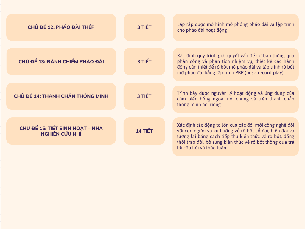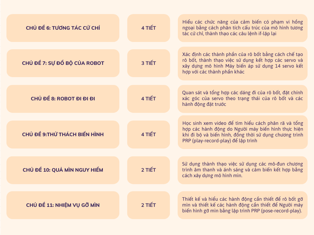 Học sinh cũng sẽ có cơ hội để phát triển kỹ năng lập trình với các thẻ lệnh cơ bản được thiết kế phù hợp với từng chủ đề và linh kiện lắp ráp liên quan. Các thẻ lệnh này bao gồm “wheel mode servo”, “angle mode”, “if…then”, “touch sensor”, “light sensor”, “repeat while” và nhiều hơn. Ngoài ra, trong từng chủ đề học tập, học sinh sẽ được đào tạo kỹ năng hợp tác, làm việc nhóm, thái độ tự tin khi trình bày sản phẩm, và cũng sẽ được khuyến khích giữ tinh thần lạc quan và chấp nhận thất bại, góp phần phát triển năng lực giao tiếp, hợp tác và thích ứng với sự thay đổi. Tất cả những điều này đều sẽ giúp học sinh phát triển năng lực giải quyết vấn đề và nâng cao kỹ năng tư duy sáng tạo.