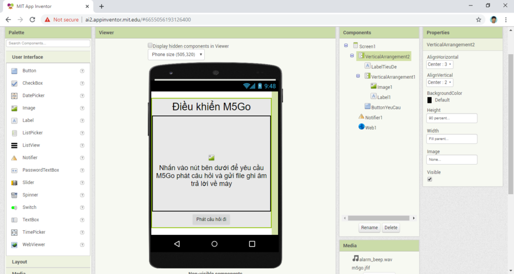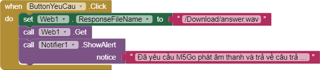 Trong ví dụ này, chúng ta sẽ dùng thành phần Web của App Inventor để gửi yêu cầu cho M5Go. M5Go được lập trình sẵn theo bài viết lập trình điều khiển M5Go, để nhận yêu cầu được gửi tới. Khi nhận được yêu cầu. M5Go sẽ phát ra một câu hỏi, ghi âm lại câu trả lời rồi phản hồi về cho ứng dụng. Ứng dụng khi nhận được file ghi âm sẽ lưu lại trên thư mục Download của điện thoại.