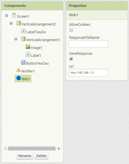 Phần xử lý trong ví dụ này khá đơn giản. Khi người dùng nhấn button trên màn hình, thành phần Web sẽ quy định nơi lưu file nhận được. Trong hình trên thì Web1 sẽ lưu file có tên là answer.wav và lưu vào thư mục Download trong thẻ nhớ.