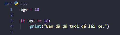 age >= 18. Nếu điều kiện đúng (tức làagelớn hơn hoặc bằng 18), chương trình in ra thông báo “Bạn đã đủ tuổi để lái xe.” - Nếu điều kiện là sai (tức là